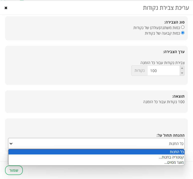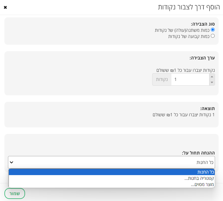 ניתן להגדיר שהצבירה תהיה לכל החנות, לפי קטגוריה מסוימת או למוצר מסוים.