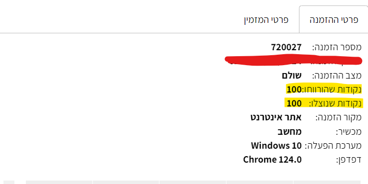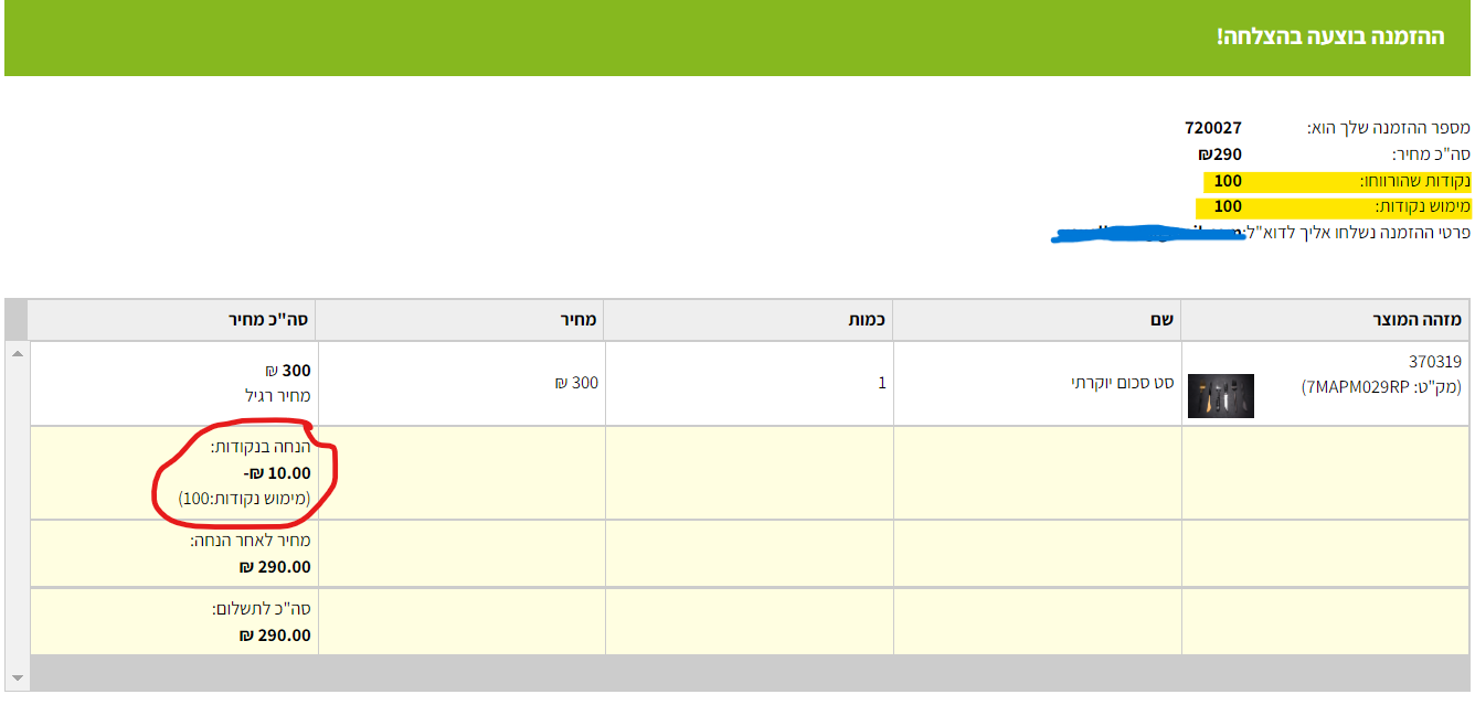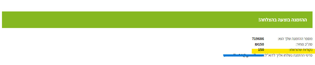 לקוח גם רואה באישור הזמנה כמה נקודות מימש וצבר :