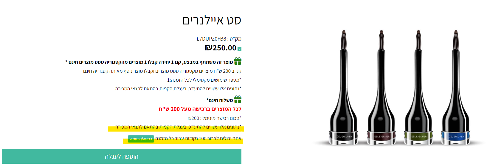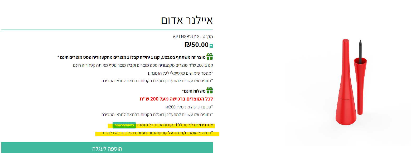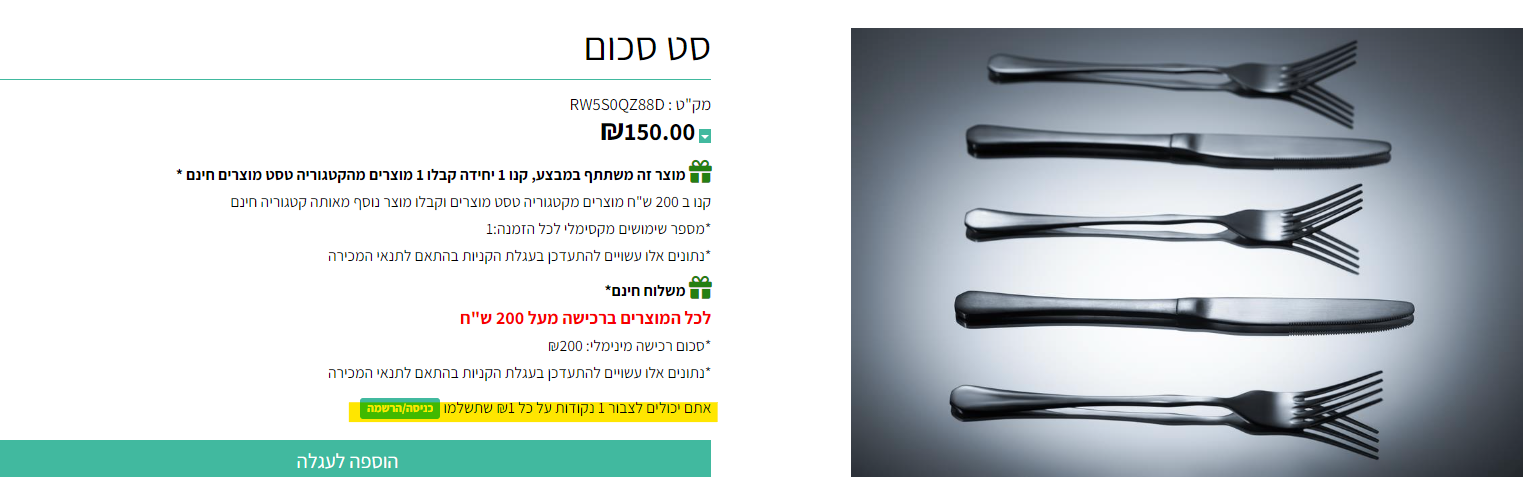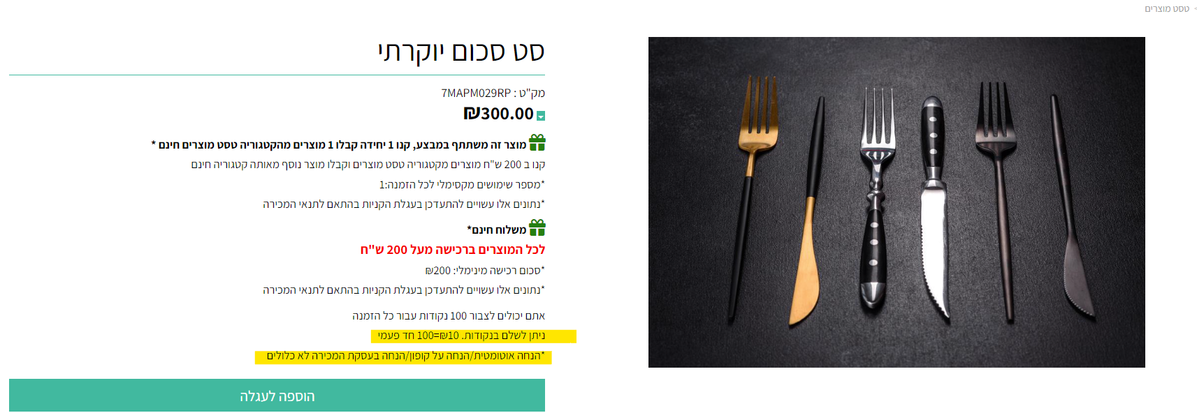כלומר לפי הדוגמה שלנו ברכישת מוצר "סט איילנרים" לקוח ישלם 250 ש"ח ויצבור 100 נקודות. ברכישת איילנר אדום לקוח ישלם 50 ש"ח ויצבור 100 נקודות.