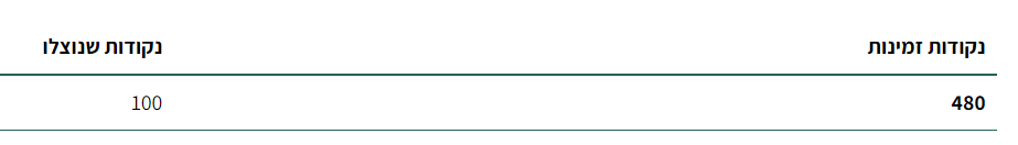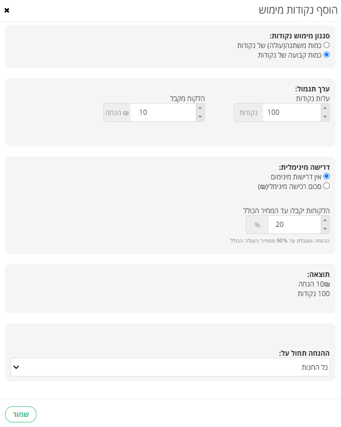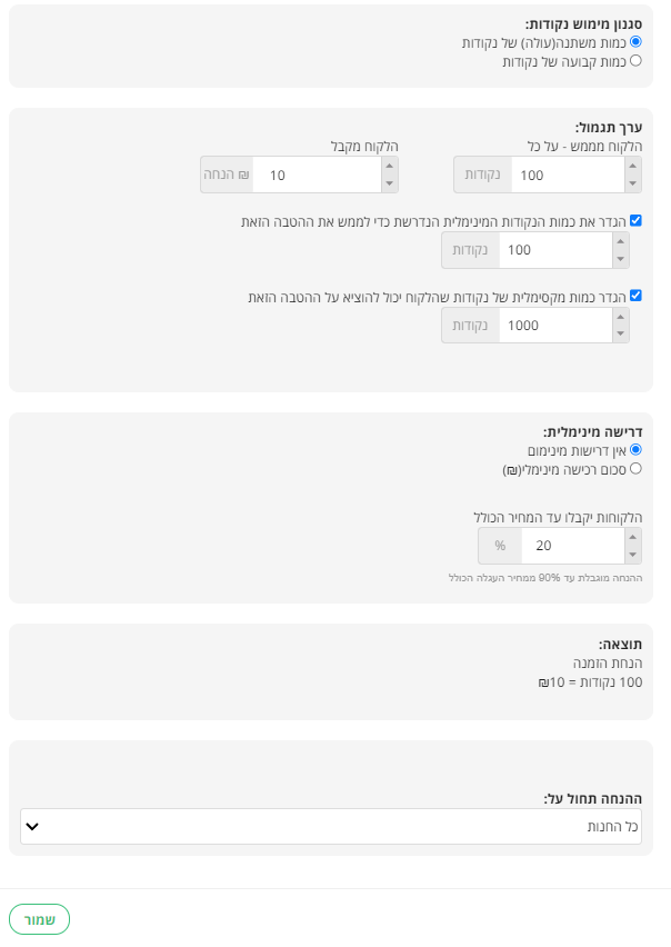 בדוגמה הגדרנו ש-100 נקודות שוות ל-10ש"ח.