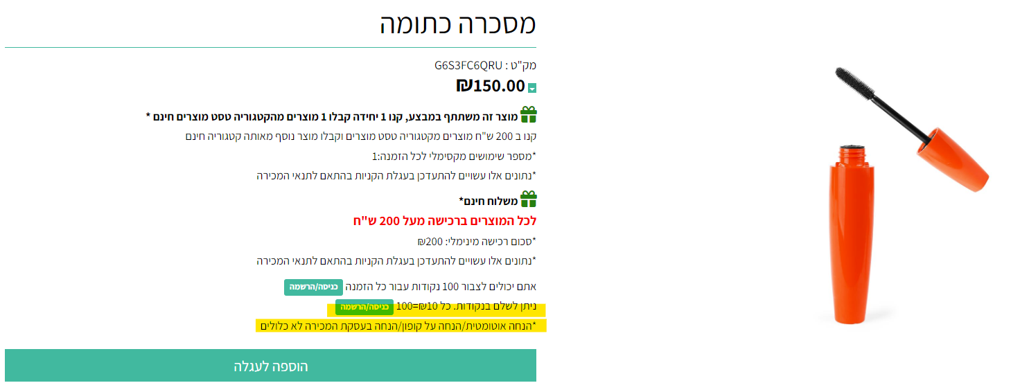 הודעה מתאימה תוצג ללקוח גם בדף מוצר: