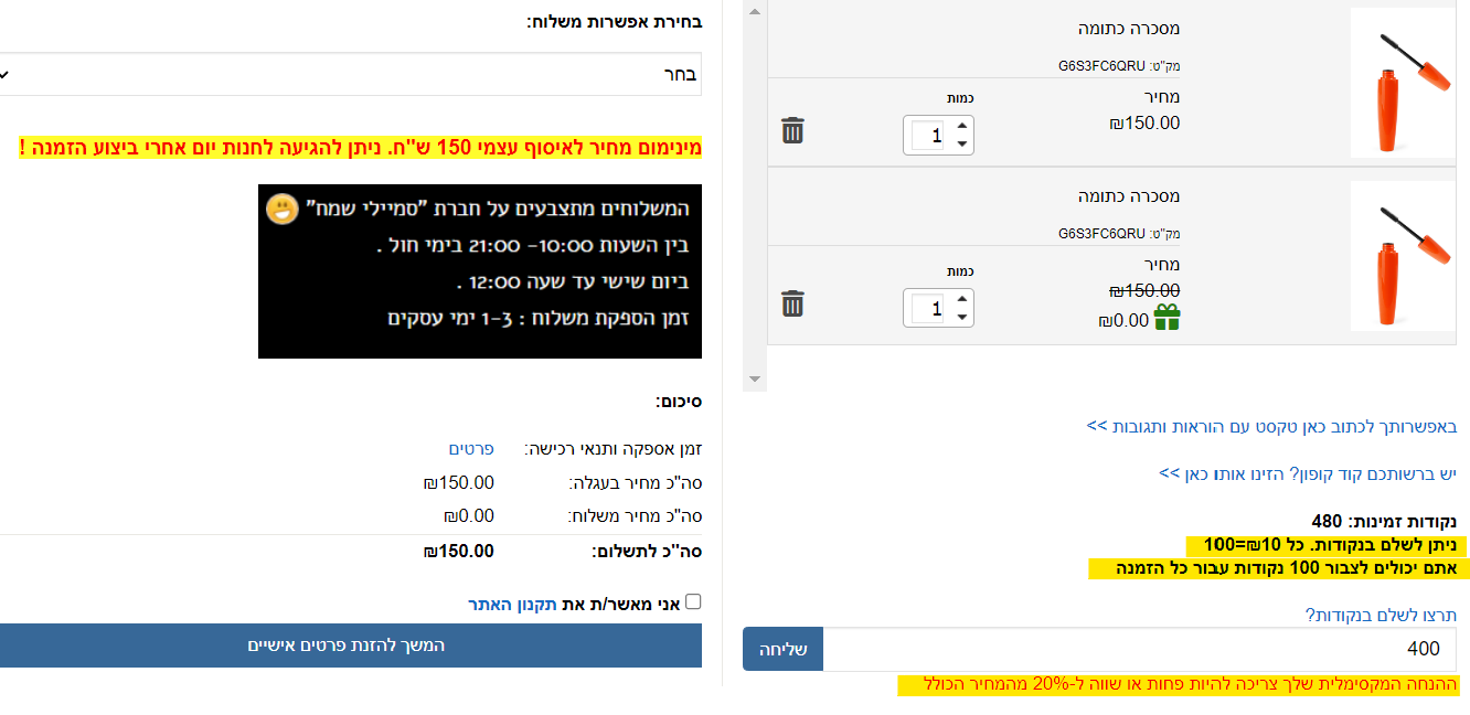 גם בעגלת הקניות תהיה הודעה בהתאם לסוג שהוגדר לנקודות מימוש.