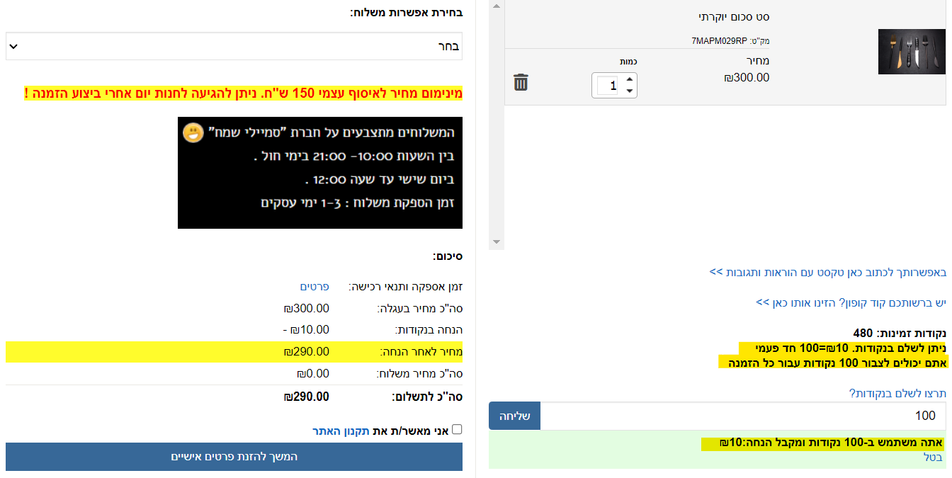 כמות נקודות מינימלית לשימות זה - 100 והגבלת שימוש נקודות לקניה -1000 נקודות.