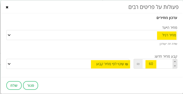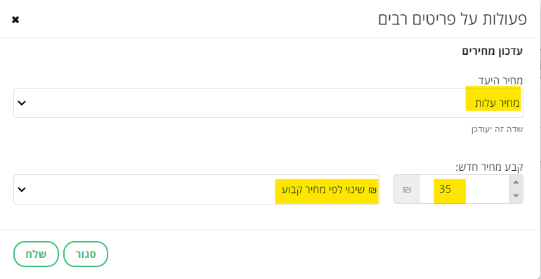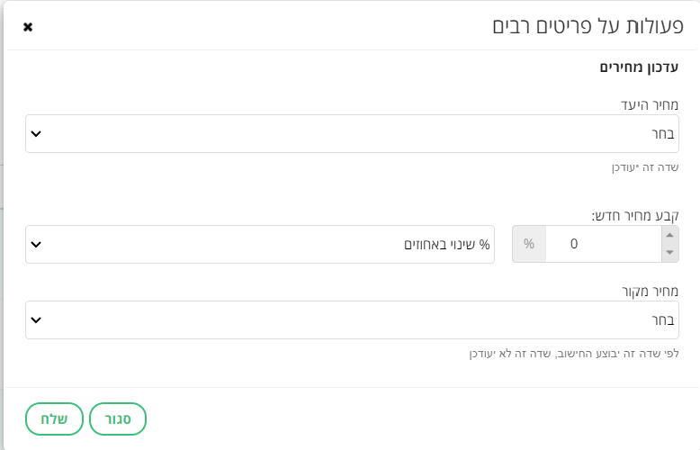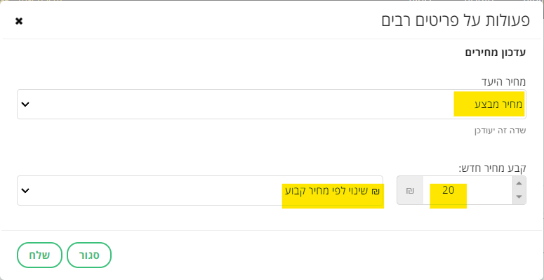 - חוזרים לתפריט ניהול מוצרים - > בוחרים בתיבת " פעולות על מוצרים רבים" -> עדכון מחירים , יוצג חלון חדש לעדכון מחיר: