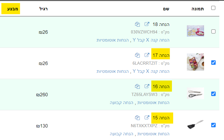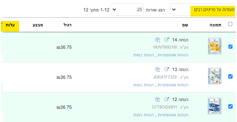 2. מסמנים את המוצרים שיש להם מחיר עלות זהה : לדוגמה יש לי שלושה מוצרים שמחיר עלות שלהם זהה ואני רוצה לעדכן את המחיר.