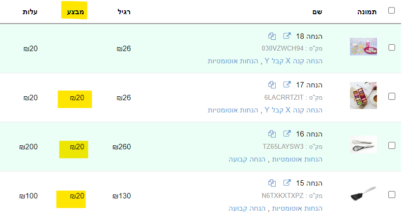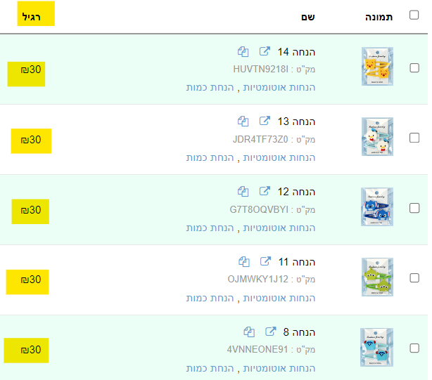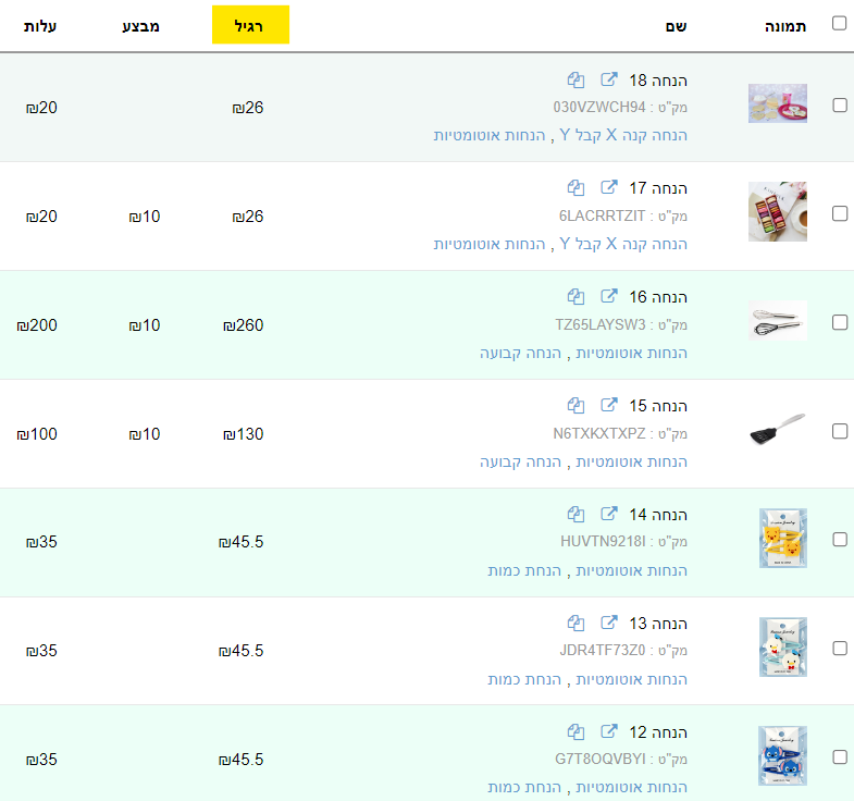 מחיר הרגיל עודכן לכל מוצרים בעמוד. לפי 30% גבוה ממחיר עלות. בצילום ניתן לראות שהמכירים רגילים שונים לפי מחיר עלות