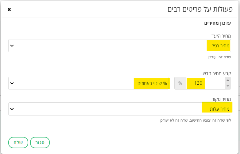 -ניתן לעדכן מחיר רגיל לכל החנות לפי מחיר עלות באחוזים גם כאשר המחירי עלות שונים ממוצר למוצר.